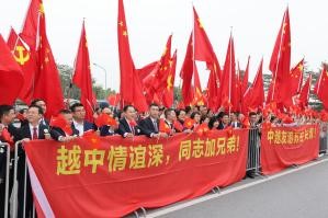 習近平乘車從機場赴下榻飯店途中,中越兩黨兩國旗幟迎風飄揚,紅色橫幅上寫著“中越友誼萬古長青!”、“越中情誼深,同志加兄弟!”。許多人自發聚集在道路兩旁,揮舞兩國旗幟,熱烈歡迎習近平到訪。