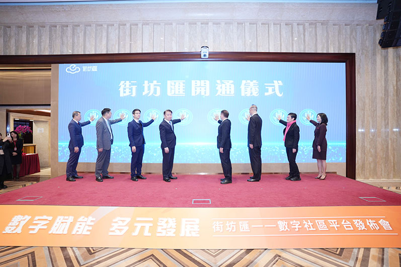 街坊總會與七彩集團於昨日上午9時假中國銀行總行大廈33樓舉行數字賦能 多元發展---「街坊匯」數字社區平台發佈會,邀請到經濟財政司司長李偉農、中央人民政府駐澳門特別行政區聯絡辦公室副秘書長兼社工部部長黃華蓋、經濟及科技發展局代副局長龐啓富、中國銀行(澳門)股份有限公司董事長李瑞強、七彩集團創始人兼董事長徐小衛、街坊會聯合總會會長吳小麗、中國銀行(澳門)股份有限公司總裁陳曉平、之江七彩雲(澳門)科技服務有限公司董事長韓霖主持「街坊匯」開通儀式,街坊會聯合總會理事長陳家良、七彩集團創始人兼董事長徐小衛、以及中國銀行(澳門)股份有限公司董事長李瑞強在儀式上分別致辭。