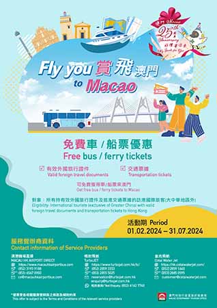 【特訊】旅遊局透過不同計劃和措施持續拓展國際客源,其中,將於2月1日起攜手往來港澳的客車及客船服務營辦商,推出“免費直達巴士車票及船票”優惠,向到訪香港的國際旅客(大中華地區外)提供從香港往澳門的免費客車和客船優惠,爭取更多國際旅客選擇來澳體驗澳門“旅遊+”元素,擴大客源,促進旅遊經濟。