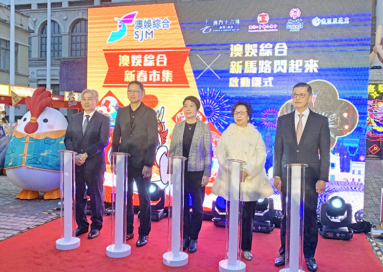 「澳娛綜合新馬路閃起來」啟動儀式昨日下午在十六浦度假村戶外廣場舉行,出席嘉賓包括:文化局局長梁惠敏、工會聯合總會理事長李從正、同善堂值理會副主席鄭秀明、特殊奧運會執行總監蕭宇康,以及澳娛綜合度假股份有限公司首席營運總監卓河祓。澳娛綜合吉祥物「森仔」亦身穿龍年喜慶服飾現身助興。