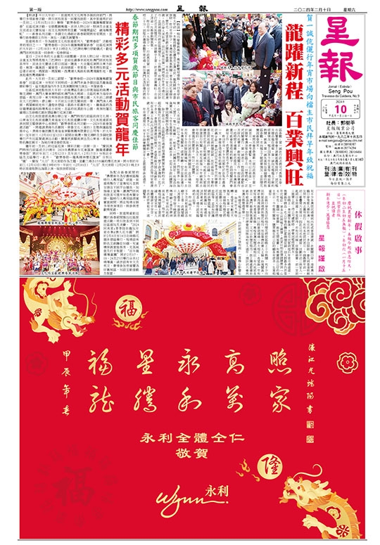 【特訊】今日大年初一,旅遊局及文化局等多個政府部門,將舉行多項新春活動,與市民和旅客一同慶祝佳節。其中旅遊局於初一及初二(2月10及11日)舉辦“歡樂春節─2024年龍騰舞躍賀新春”社區巡演活動,安排醒獅舞龍、吉祥人物公仔、財神及金童玉女派送金元寶祝福;而文化局將特別呈獻“神龍開盛紀 鏡海舞霓虹”——新春系列活動,多個文化場館在新春期間將如常開放,並舉行新春應節工作坊、演出、活動及展覽等。