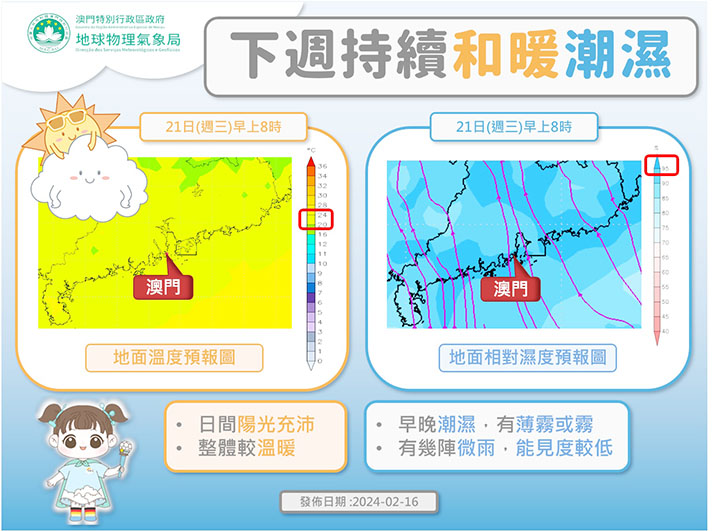氣象局展望下週後期的天氣,將有另一股東北季風抵達華南沿岸,屆時本澳的氣溫將再度逐步下降。由於冬末春初的天氣較常乍暖還寒,氣象局呼籲市民多留意天氣變化,適時增減衣物,並及時關注局方的最新天氣資訊。