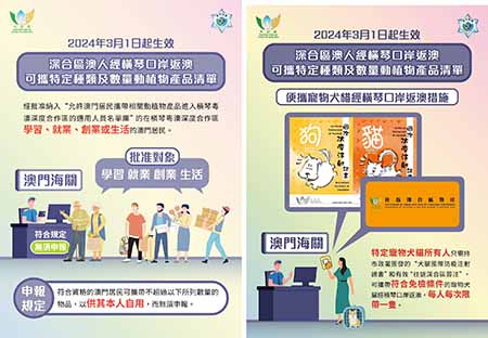 【特訊】澳門海關及市政署表示,配合深合區「一線放開,二線管住」分線管理模式更好地落實,實現澳門與深合區之間進一步便捷流通。自3月1日起,在橫琴粵澳深度合作區學習、就業、創業或生活,且已納入「允許澳門居民攜帶相關動植物產品進入橫琴粵澳深度合作區的適用人員名單庫」(「適用人員名單庫」)的澳門居民,可攜帶供其本人自用,且符合特定種類及數量的食品及鮮花等動植物產品經橫琴口岸返回澳門,無需申請進口准照或作出相關申報。而對於已被納入上述「適用人員名單庫」的寵物犬貓所有人,若名下的犬貓已在市政署植入電子晶片,只需持有市政署簽發的「犬貓國際防疫注射證書」和有效「往返深合區簽注」,亦可攜同符合免檢條件的寵物犬貓經橫琴口岸返澳。上述通關檢疫便利措施及新安排,將稍後透過行政長官批示方式頒布。