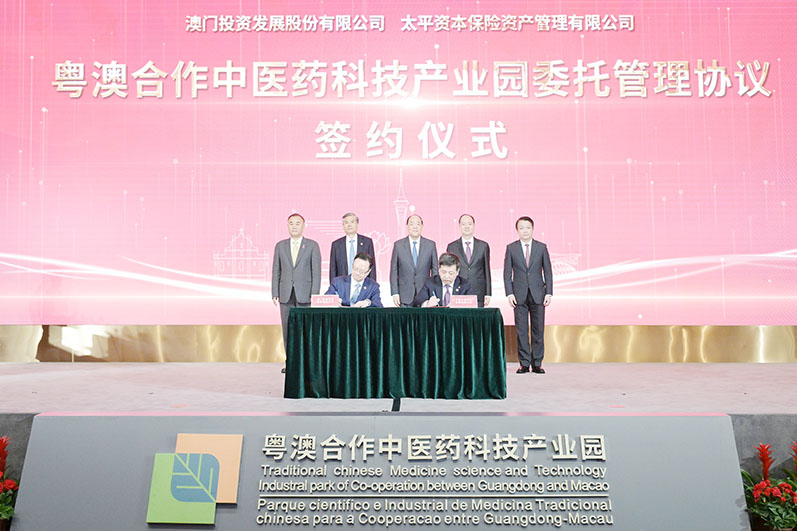 在澳門特別行政區行政長官、橫琴粵澳深度合作區管理委員會主任賀一誠,中央人民政府駐澳門特別行政區聯絡辦公室主任鄭新聰,中國太平保險集團董事長王思東,澳門特別行政區經濟財政司司長、橫琴粵澳深度合作區執行委員會主任李偉農和中國太平保險集團副總經理李可東見證下,由澳門投資發展股份有限公司主席吳建峰與太平資本保險資產管理有限公司總經理吳松代表雙方簽署《粵澳合作中醫藥科技產業園委托管理協議》,正式建立委托管理關係,共同推進產業園提升服務品質,加快產業聚集。國家中醫藥管理局局長余艶紅,副局長兼中國中醫科學院院長黃璐琦,廣東省政府橫琴辦主任、橫琴粵澳深度合作區執行委員會副主任聶新平,中國銀行業務管理總監趙蓉,中國工程院院士、中醫證候全國重點實驗室主任劉良教授等出席簽約儀式。