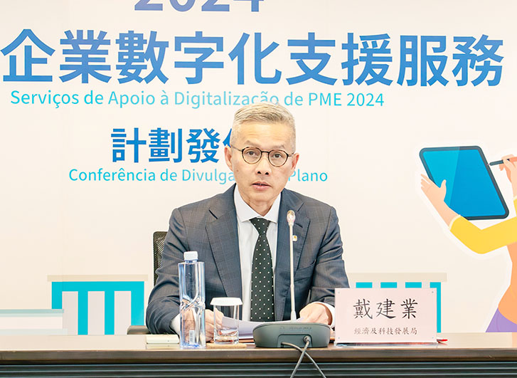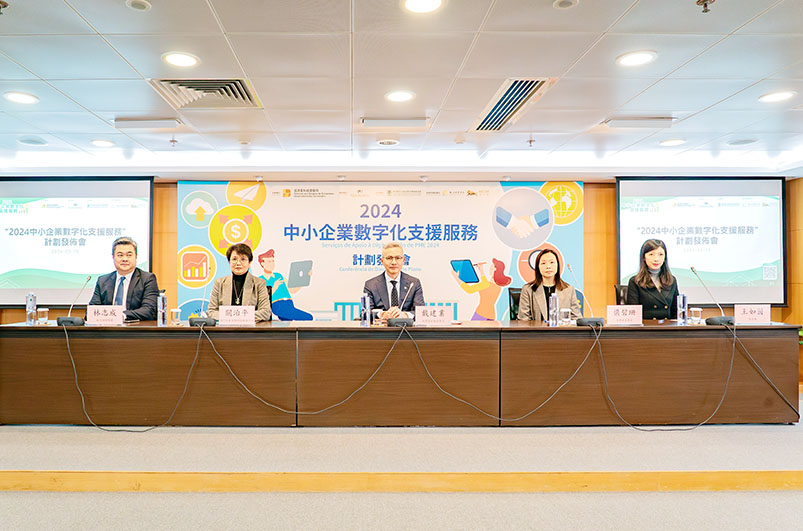 「2024中小企業數字化支援服務」計劃發佈會於昨午舉行,經濟及科技發展局局長戴建業、澳門生產力暨科技轉移中心理事長關治平、消費者委員會主席梁碧珊、支持及贊助單位代表銀河娛樂集團總辦事處行政副總裁林志成及美高梅公共及社會事務高級副總裁王如茵等出席。