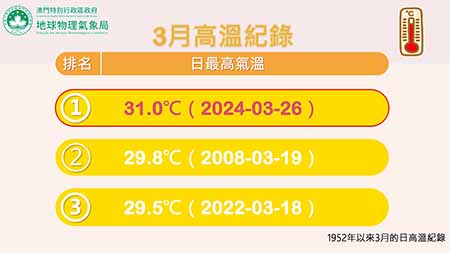 氣象局表示,本澳昨日受微弱東北季風影響,天氣普遍晴朗少雲,大潭山氣象站在下午錄得最高氣溫攝氏三十一度,是本澳自一九五二年以來三月份的最高紀錄,對上一次三月份的最高氣溫是二零零八年三月十九日,當天最高溫錄得二十九點八度。