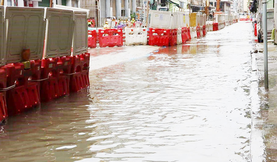 內港一帶昨日中午過後出現海水倒灌,比厘喇馬忌士街往十六浦方向輕微水浸,水位至腳踝,河邊新街不能轉入貨倉巷,鹽巷亦實施臨時交通措施,交通事務局呼籲駕駛者留意。