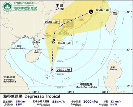 氣象局於昨日下午五時三十分發出一號風球,氣象局表示,位於南海北部的低壓區已發展為熱帶低氣壓,按照現時預測路徑,將於今天晚間至週六(六月一日)清晨在廣東西部至珠江口一帶登陸。由於熱帶低氣壓將進一步增強,局方會視乎發展強度,評估是否需要改發更高風球。受其雨帶影響,今日開始本澳驟雨漸轉頻密,稍後雨勢有時頗大及有雷暴,累積雨量較高。
