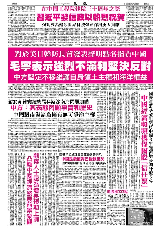 對於美日韓防長會發表聲明點名指責中國 毛寧表示強烈不滿和堅決反對 中方堅定不移維護自身領土主權和海洋權益