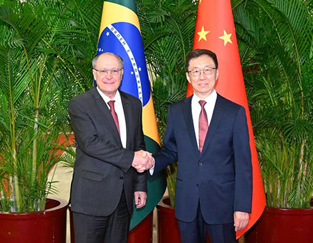 【中新社北京6月6日電】中國國家副主席韓正6日在北京同巴西副總統阿爾克明舉行會談並共同主持中巴高層協調與合作委員會第七次會議。