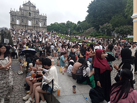 端午假期有不少旅客和旅行團觀光,有旅客表示,澳門是很好的旅遊地點,有優美的風景及很多美食,但因天雨鞋襪濕透,影響遊玩體驗;張女士一家大小來自佛山,她稱因為帶著小朋友,較擔心人太多,下次來澳會選擇錯峰出行。有旅行團團客表示,隨團來澳一天遊,認為比想像中人多;亦有導遊表示,來澳旅客較多是個人遊旅客,期望多些內地旅客報團。