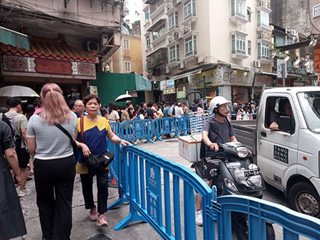 端午節假期第二日,大三巴一帶人流暢旺,中午至傍晚時分需要實施人潮管制,大三巴街行人只可單向上行前往牌坊,並取道周邊的街巷如大關斜巷、關前後街、高園街等離開。此外,關前後街的行車道亦同時封閉,車輛從營地大街駛至該路口時必須左轉入草堆街,同時因應大三巴實施單向人潮措施,車輛不能由高園街左轉大三巴斜巷。