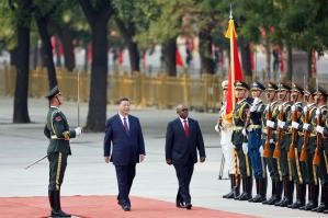 會談前,習近平和夫人彭麗媛在人民大會堂東門外廣場為恩巴洛和夫人迪尼西婭舉行歡迎儀式。