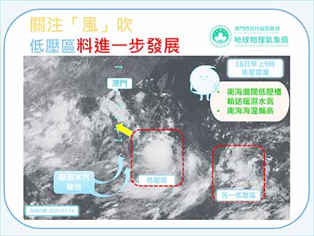 氣象局表示,現時位於菲律賓以南的低壓區,將於未來一至兩日進入南海,而南海正有一道活躍且伴隨大量暖濕水汽輸送的廣闊低壓槽。因此,預料該低壓區進入南海後將進一步發展,且有機會發展為熱帶氣旋。