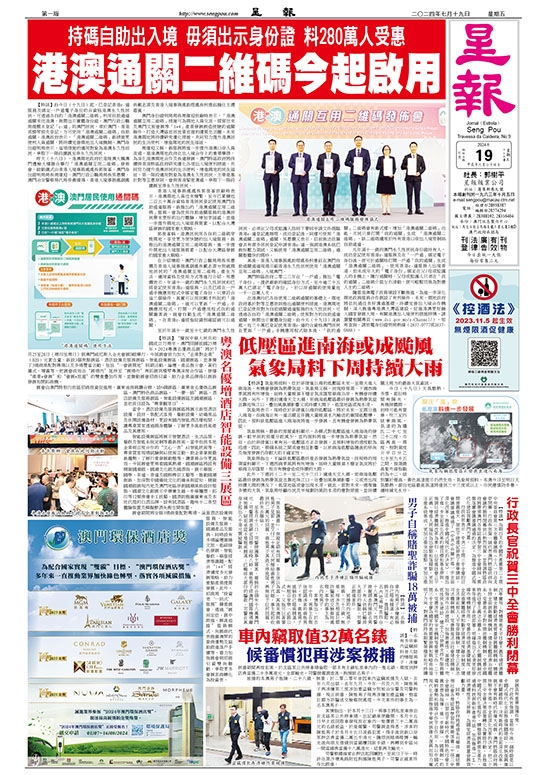 今日(十九日)天氣酷熱,多雲,部份時間有陽光, 有幾陣驟雨,初時可能有雷暴,吹三至四級東南風,氣溫約為攝氏二十七至三十二度,市區再高一兩度,相對濕度介乎百分之七十至九十五之間,預測最高紫外線指數約為十二,級別屬於極高。黃色高溫提示仍然生效,氣象局預料,本澳今日至明日天氣酷熱,部份地區最高氣溫將達到三十三度或以上,市民應慎防中暑,適時補充水分。