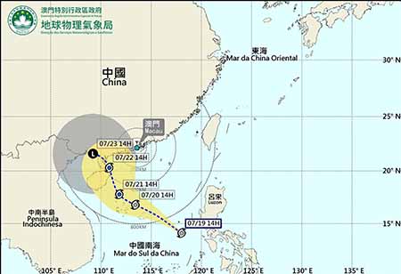 氣象局表示,位於南海中部的低壓區已增強為熱帶低氣壓,按照現時預測路徑,預料今日(二十日)將進入本澳八百公里範圍內,屆時本局會發出一號風球,預料該熱帶低氣壓將大致吹向廣東西岸至海南島一帶,強度逐漸增強,受其影響本澳周日(二十一日)開始驟雨會增多及有幾陣雷暴。於昨日下午二時,熱帶低氣壓正集結在南海中部,位於澳門東南偏南約一千零一十公里處,以時速約二十五公里向西北方向移動,橫過南海中部。氣象局呼籲巿民留意最新天氣資訊,並適時做好預防措施。