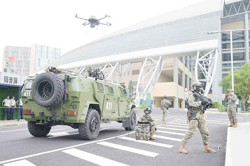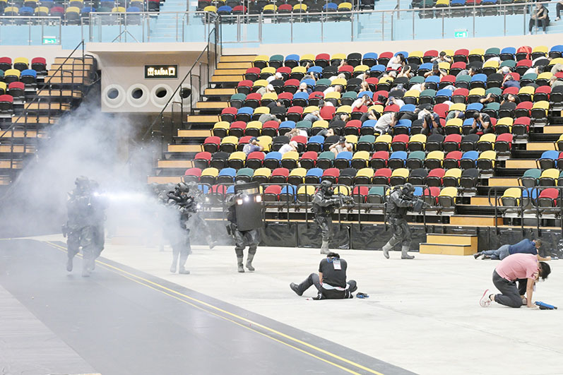 【特訊】警察總局聯同解放軍駐澳部隊,以及多個部門及機構,於昨日下午三時在東亞運體育館,開展代號為「盤龍」的大型聯合反恐演練,模擬一場大型演唱會發生涉及化學武器的恐怖襲擊及挾持事件。今次演練超過一千名人員參與,警察總局希望透過演練,加強軍警之間聯動協作機制,測試各前線單位應對恐怖襲擊事件、聯動協作和處理能力。