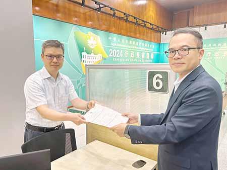 【特訊】第六任行政長官選舉提名期昨日結束,選管會表示,提名期內,共有十一人領取行政長官候選人提名表,有一人提交提名表。第六任行政長官被提名人岑浩輝代理人李煥江昨日再到公共行政大樓選舉事務櫃檯再提交候選人提名表,新增三名選委提名岑浩輝,其獲得三百八十六名選委的提名支持。