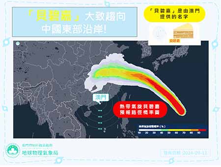 氣象局稱,此外,「貝碧嘉」是由本澳提供的熱帶氣旋名字。從現時的數值模式預報資料顯示,西北太平洋仍然具備條件持續發展並生成熱帶氣旋,但各模式對於其實際生成的位置及動向,仍然存在較大的分歧;初步預計,下週中後期較大機會有一至兩個熱帶氣旋於西北太平洋至南海一帶生成,氣象局將持續監察其發展,呼籲市民持續關注局方的最新天氣資訊。