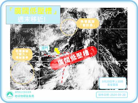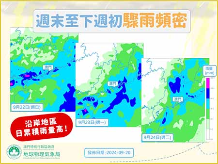 氣象局預測,隨著該低壓槽移近華南沿岸,週末至下週初(二十一至二十四日),本澳將有持續驟雨及幾陣雷暴。其中,預料週日(二十二日)及週一(二十三日)驟雨最為頻密,日累積雨量較高。