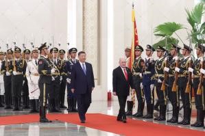 天安門廣場鳴放21響禮炮,禮兵列隊致敬。兩國元首登上檢閱台,軍樂團奏中馬兩國國歌。易蔔拉欣在習近平陪同下檢閱中國人民解放軍儀仗隊,並觀看分列式。