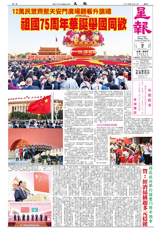 【特訊】特區政府昨日(一)日舉行慶祝中華人民共和國成立七十五周年招待酒會。行政長官賀一誠致辭時表示,今年也是澳門回歸祖國廿五周年,廿五年來,國家把澳門作為掌上明珠,始終是澳門保持繁榮穩定的最堅強後盾,始終為澳門發展提供最大機遇。在中央的堅強領導下,在祖國內地的大力支持下,澳門特區歷屆政府和社會各界同心協力,開創了澳門歷史上最好的發展局面,譜寫了具有澳門特色的「一國兩制」成功實踐的華彩篇章。