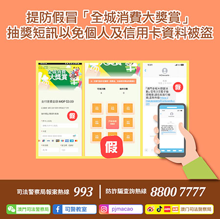司警局於昨日發現有騙徒假冒「全城消費大獎賞」的名義,隨機向市民發送釣魚短訊,短訊內訛稱有抽獎機會,誘騙市民點擊短訊內附帶之連結,有關連結進入後為一個假冒「全城消費大獎賞」的網頁,並訛稱市民已中獎,要求輸入個人資料及信用卡資料,以此套取市民信用卡資料後隨即進行未經授權之大額交易,令市民蒙受損失。