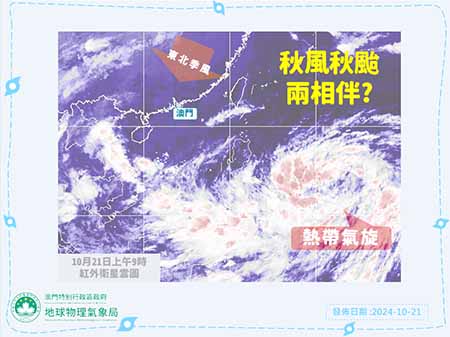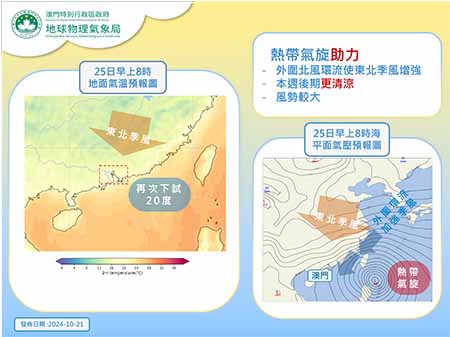 另一方面,隨著內陸冷高壓增強,預料一股東北季風將於今日(二十二日)後期抵達華南沿岸,屆時將為廣東沿岸帶來較清涼及乾燥的天氣。同時,隨著準「潭美」持續向西移近,其外圍環流將助力東北季風增強,並為本澳帶來較為明顯的降溫,本週後期最低氣溫將可能降至攝氏二十度,且風勢較大。因應本澳未來數日早晚天氣將漸轉清涼,而日間陽光充沛下,日夜溫差較大,公眾出門宜帶備輕便風衣或外套,以免著涼。