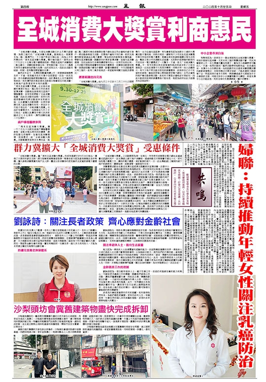 她續指,婦聯長期關注居民身心健康,包括在轄下婦女醫療中心提供免費乳健檢查及子宮頸抹片檢查服務,以及透過各區家庭服務中心舉辦不同類型的健康講座等,推動社區居民重視自我健康管理。未來也將繼續積極配合當局《健康澳門藍圖》及癌症防治工作,做好社區醫療服務及推廣服務,共建健康美好家園。