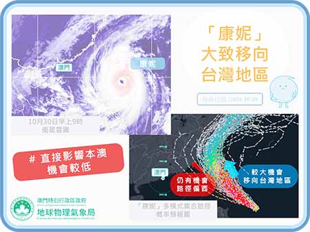 氣象局表示,位於菲律賓呂宋東北面的熱帶氣旋「康妮」,按照現時預測路徑,未來兩日將趨向台灣地區,隨後移近福建沿岸,預料對本澳造成直接影響的機會較低。氣象局指出,按現時各大模式的資料預測,「康妮」較大機會於本週後期趨向台灣地區,並於今日(三十一日)日間進入本澳八百公里範圍,隨後移近福建沿岸。目前預料「康妮」對本澳造成直接影響的機會較低;但仍未能完全排除「康妮」轉向採取較偏西方向及移近廣東東部沿岸的路徑。氣象局將密切監測其動向,並適時向公眾發佈最新資訊。