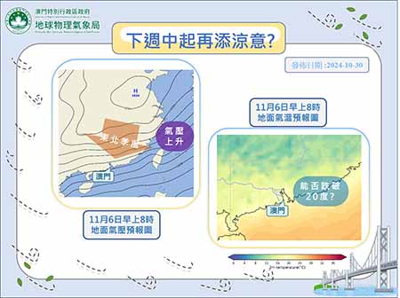 另外,氣象局預料,本澳未來數日早晚天氣清涼,大致天晴及乾燥,吹較大偏北風。而受高空擾動影響,本澳下週初雲量增多,並伴有幾陣驟雨;展望下週中後期東北季風增強,華南地區將進一步降溫,至於本澳的降溫程度,則視乎東北風的強度。