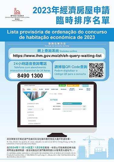 申請人可透過房屋局網頁的排序查詢系統(https://www.ihm.gov.mo/zh/eh-query-waiting-list)、微信及24小時語音電話(8490 1300)查詢申請情況。