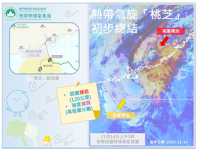 氣象局總結今次熱帶氣旋時表示,時隔數日,熱帶氣旋「桃芝」取代「銀杏」成為本澳有記錄以來第二遲發出的三號風球記錄。熱帶氣旋「桃芝」於週初進入南海後,穩定以西北方向移近廣東沿岸,並於昨日日間在本澳以南一百二十公里附近徘徊。