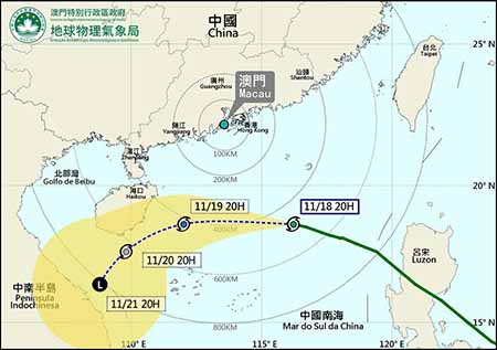 氣象局表示,按照現時預測路徑,熱帶氣旋「萬宜」今日(十九日)最接近澳門,在本澳以南約三百五十公里範圍外掠過,在「萬宜」及東北季風共同影響下,預料明日本澳風力達六級及有陣風,氣溫略降,有幾陣雨及雨勢漸轉頻密,因此今日凌晨至清晨發出三號風球的機會為中等至較高,預料「萬宜」未來兩日將橫過南海北部,隨後轉西南移動並逐漸減弱。截止昨晚八時,強烈熱帶風暴萬宜正集結在澳門東南約四百八十公里處,以時速約十八公里向西北偏西方向移動,橫過南海北部。