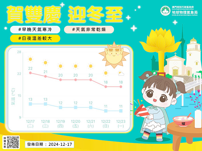 氣象局指出,預料未來數日,東北季風將持續影響本澳,回歸日(二十日)及冬至(二十一日),早晚天氣寒冷,天氣會持續天晴及非常乾燥,最低氣溫介乎攝氏十一至十二度左右,由於日夜溫差較大,巿民外出時要注意合適的衣著穿搭。展望聖誕節假期,冷空氣仍持續活躍,早晚天氣寒冷,普遍天晴及非常乾燥。