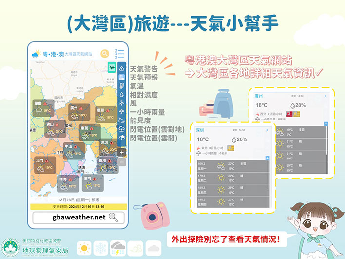 由廣東省氣象局、香港天文台、澳門地球物理氣象局三地共同合作,提供灣區主要城巿的天氣資訊及天氣警告。由世界氣象組織 (WMO)統一收集世界各地官方氣象部門的天氣資訊,巿民只需輸入關注的國家/城巿名稱,即可查閱當地官方的最新天氣資訊。