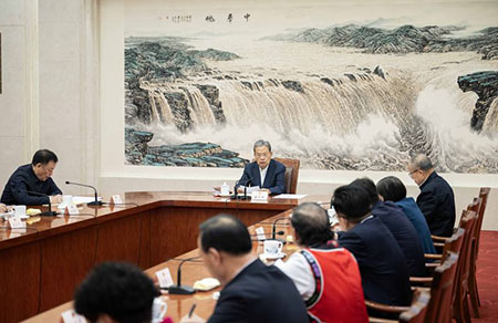 中共中央政治局委員、全國人大常委會副委員長李鴻忠主持座談會。