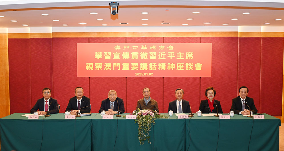 【特訊】澳門中華總商會昨(2)日下午在會址舉行「學習宣傳貫徹習近平主席視察澳門重要講話精神座談會」。座談會由中總副會長賀定一主持。全國政協委員、中總理事長馬志毅,全國人大代表、中總副理事長劉藝良先後向與會的會長、會董、理事、監事、青委、婦委、部委、團體會員代表等分享學習習主席視察澳門重要講話精神的體會和心得。中總永遠會長馬有禮、會長崔世昌、副會長高開賢、賈天兵等二百五十人出席座談會。