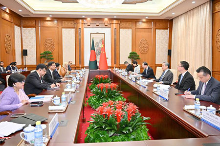 王毅說,你把中國作為就任後首次訪問的國家,體現了孟加拉臨時政府和你本人對中孟關係的高度重視。中國和孟加拉是守望相助的好鄰居、共謀發展的好夥伴。建交50年來,雙方始終相互尊重、平等相待、合作共贏,樹立了國家間關係的典範。中方始終把孟加拉置於周邊外交重要方向,奉行面向全體孟加拉人民的睦鄰友好政策。今年是中孟建交50周年,也是“中孟人文交流年”,兩國關係發展面臨新機遇。中方願同孟方一道,賡續傳統友誼,加強戰略溝通,深化務實合作,高品質共建“一帶一路”,推動中孟全面戰略合作夥伴關係不斷向前發展。