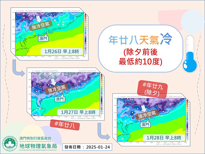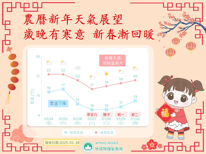 【特訊】氣象局預測,與一股強烈冬季季風相關的強冷空氣,將於週日(二十六日)日間抵達廣東沿岸,屆時本澳氣溫將顯著下降,北風亦將顯著增強,新春前夕年廿八及廿九 (二十七及二十八日) 的最低溫將降至攝氏十度左右。氣象局預測,農曆年初一早晚天氣仍然寒冷,天氣預報顯示氣溫介乎攝氏十一度至十九度,而隨著冬季季風的逐步緩和,年初二至三氣溫亦將逐步回升,預測年初二氣溫為攝氏十三度至二十度。