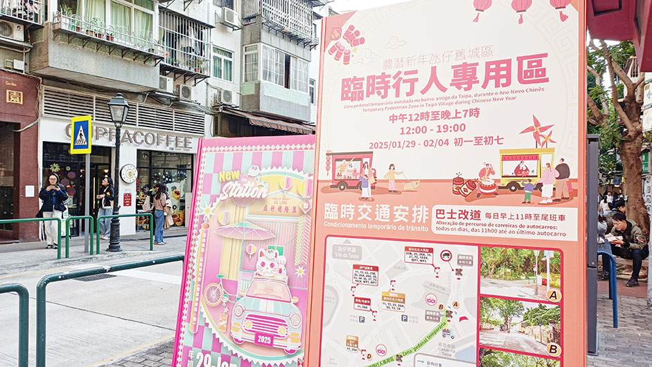 臨時行人專用區將於一月二十九日至二月四日(年初一至年初七)每日中午十二時至晚上七時,在氹仔舊城區設置。範圍由飛能便度街與素啤古街交界(嘉模泳池巴士站前),至告利雅施利華街與巴坡沙總督街交界(路氹歷史館),當中包括兵房斜巷至嘉路士米耶馬路部分路段。經濟及科技發展局聯同旅遊局連日來展開多方位宣傳,透過宣傳單張、大型橫幅廣告、指示牌、媒體廣告、宣傳片、網上專頁等線上線下不同渠道,廣泛向居民、旅客和商戶推廣有關措施,及早知悉安排,亦提醒旅行社注意臨時行人專用區的交通改道及旅遊巴上落客事宜。