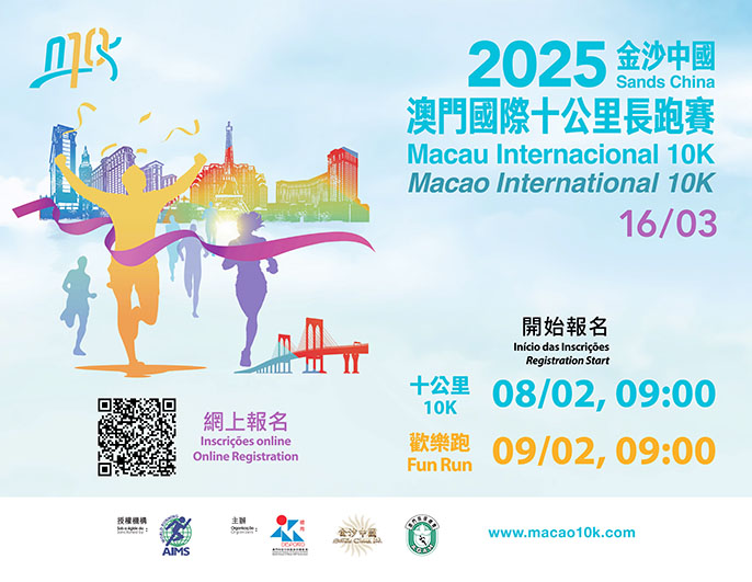 據介紹,「2025金沙中國澳門國際十公里長跑賽」的各項目報名名額為:十公里七千名及歡樂跑(約五公里) 三千名。十公里賽將於比賽當日早上七時起跑,歡樂跑則於七時四十五分起跑,起跑地點為西灣湖廣場,十公里賽的比賽路線將途經西灣大橋及金光大道,終點為奧林匹克體育中心運動場。
