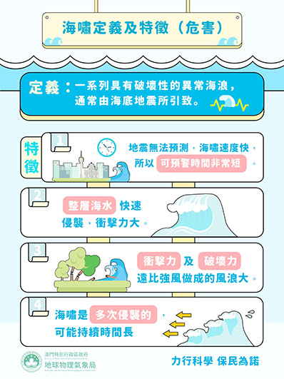 海嘯與地震息息相關,通常由海底地震所引致,但不是所有海底地震都會引發海嘯,一般只有震級較大、震源深度較淺、水深較深的海底地震才有可能引發海嘯。根據相關研究顯示,本澳主要的海嘯威脅源自馬尼拉海溝(菲律賓以西的南海東部),縱使機會較低,但若該區發生七級以上的海底地震,就有可能誘發海嘯波,並在三至四小時內影響本澳。因此,公眾應提高安全意識,熟悉本澳的海嘯預警資訊及相關避險措施,以防患未然。