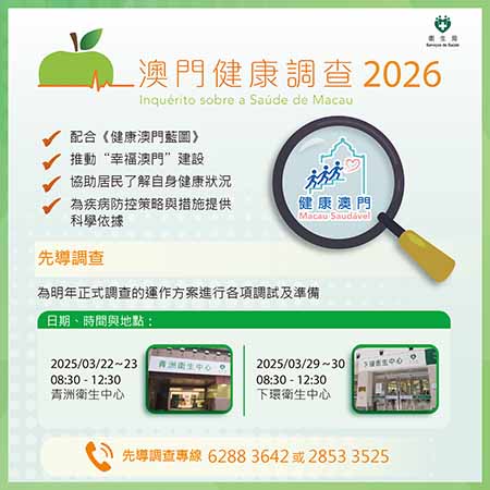 【特訊】為貫徹落實《健康澳門藍圖》各項目標和指標,推動實現“幸福澳門"的願景,衛生局正積極籌備“澳門健康調查2026",協助居民了解自身健康基本情況,提升主動健康管理的意識和能力。過程中將收集澳門成年人群常見慢性病與患病風險因素、是否患有傳染病等資料數據,為疾病防控策略與措施提供科學依據。是次健康調查同時邀請到內地權威項目《國民健康調查》專家團隊(北京協和醫學院基礎學院/中國醫學科學院基礎醫學研究所)進行合作,提供技術指導和培訓,並新增聽力(部份對象)、握力兩個測量項目。整個調查所涉及的個人資料將按照澳門第8/2005號法律《個人資料保護法》規定嚴格處理,只作群體性統計分析用途。