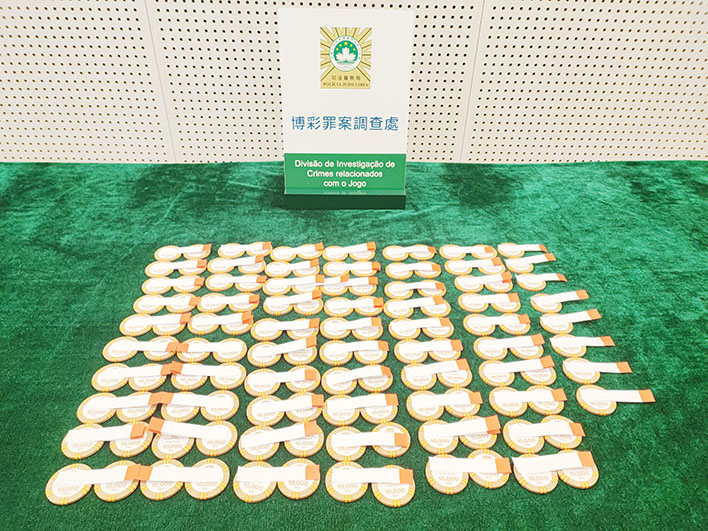 案情指出,司警早前收到情報,指有內地犯罪集團由去年中開始,多次來澳針對賭客及換錢黨行使假碼,經分析鎖定目標及部署。本月十九日晚,涉案的劉、包及烏姓男子再經關閘再入境被捕,司警在其中兩人身上起出六十一個面值一萬港元的假籌碼,並發現疑犯將另外十九個同款的假碼。警方根據線索,翌日在本澳某賭場拘捕涉案的偲、陶、阿及王姓男子,起出四十八個同款假碼。司警在該七人合共起出一百二十八個一萬元假碼,全部未流入市面。