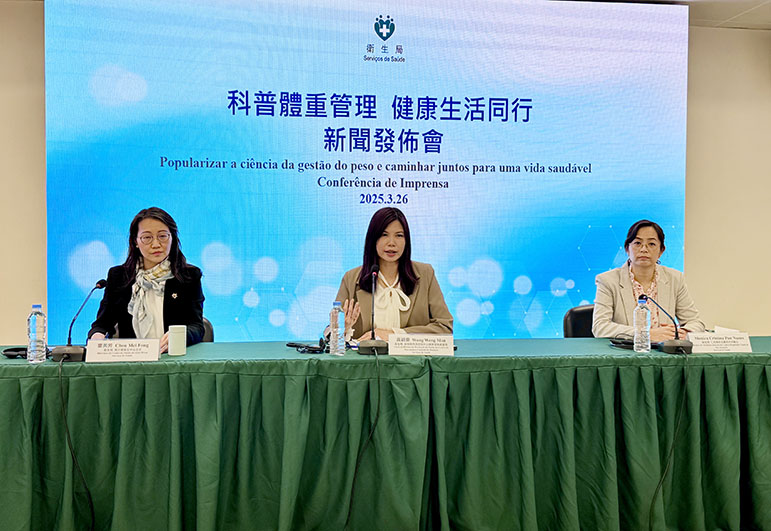衛生局昨日舉行「科普體重管理 健康生活同行」新聞發佈會,疾病預防及控制中心健康促進處處長黃穎雯、黑沙環衛生中心主任曹美芳及仁伯爵綜合醫院內科醫生Monica Cristina Pon Nunes出席介紹相關內容。