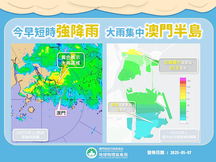 氣象局表示,受低壓槽影響,本澳昨日天氣不穩,大雨集中影響澳門半島,截昨日上午十一時部份地區累積總雨量已超過一百毫米,昨日清晨時份大雨開始影響珠江口以西地區,雨區幾乎停留不動。接近昨日早上七時,由於整體大氣較不穩定,本澳以北位置開始有新的強雨區發展,本局遂先後發出特別天氣信息提醒及發出黃色暴雨警告。期間大雨集中影響澳門半島以北,最大一小時滾動累積雨量為四十五點八毫米,而路氹地區雨量偏少,路環地區甚至只有1毫米雨量。