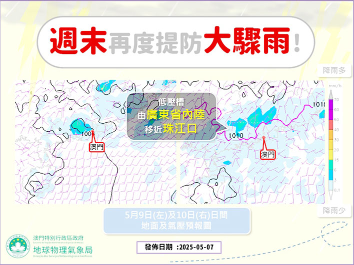 氣象局指出,暴雨發展的隨機性相當高,即使本澳面積相當細小,但暴雨實際分佈的地區差異性仍相當大。根據氣象局於去年資料統計,去年共發出四十七次暴雨警告,當中只有約四分之一的個案,暴雨能廣泛影響本澳各區。氣象局預計,未來一兩日低壓槽將會減弱,未來一兩日陽光會增多。但預料本週後期受另一道低壓槽影響,週五稍後至週日初時(九至十一日)本澳驟雨將再度增多,並可能會出現短時強降雨或持續暴雨。藉此,氣象局提醒,市民密切留意最新天氣資訊,同時外出帶備雨具及適時調整出行計劃。