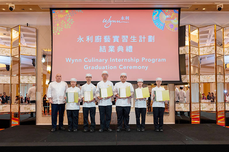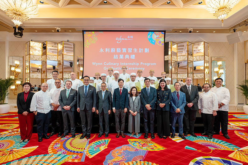 【特訊】永利致力推動本地青年人才發展,持續為其創建全方位的學習與發揮潛能的專業平台。在教育及青年發展局的倡議下,永利與中葡職業技術學校開展「校企合作」,自2021年起推行「永利廚藝實習生計劃」,助力為澳門培育餐飲業人才,為本地青年提供多元職業選擇。該計劃自開辦以來,迄今已成功培育近 40 名中葡職業技術學校廚藝專科學生,持續為澳門餐飲業發展儲備人才。日前,第四屆「永利廚藝實習生計劃」畢業典禮於永利皇宮圓滿舉行,參與計劃的學員順利完成為期一學年的實習培訓後,在多名嘉賓及家長們的見證下獲頒畢業證書,成為具備專業素質的廚藝新力軍。