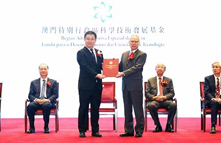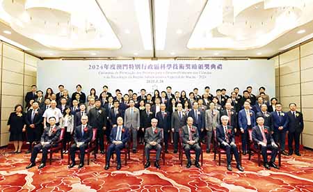 科學技術發展基金昨午假中國與葡語國家商貿合作服務平台綜合體舉行二零二四年度澳門科學技術獎勵頒獎典禮。行政長官岑浩輝、中聯辦主任鄭新聰、外交部駐澳特派員公署特派員劉顯法、戴建業、科學技術發展基金行政委員會主席謝永強以及澳門科學技術獎評審專家代表等出席,並爲科學技術獎勵獲獎者頒獎。國家科技部、廣東省科學技術廳、珠海市科技創新局、本澳政府部門、高等院校及科技團體等三百多名代表出席頒獎典禮。